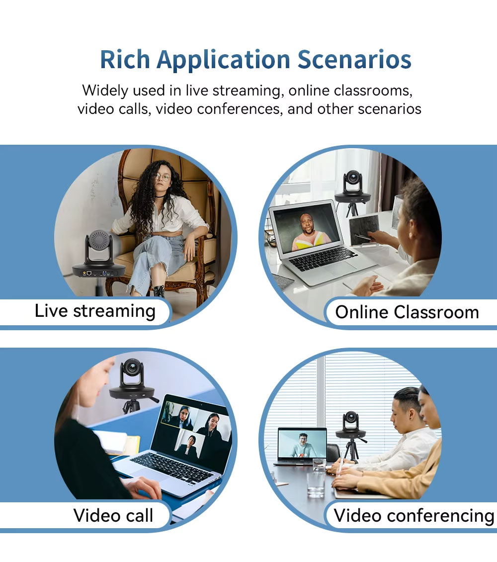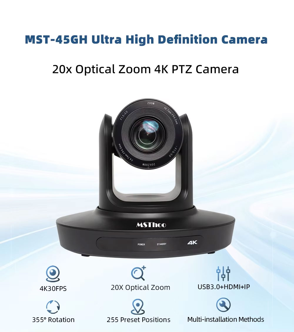 Camera Họp Hội Nghị Truyền Hình Trực Tuyến MST-45GH 4K UHD Zoom 20X Có thể được dùng cho nhiều lĩnh vực khác nhau như: Giáo Dục, y Tế, Giải trí, truyền thông marketing...Chủ yếu đáp ứng nhu cầu truyền hình trực tuyến từ xa. Ngoài ra có thể dùng cho bệnh viện, quan sát phòng bệnh nhân, phòng giải phẫu...